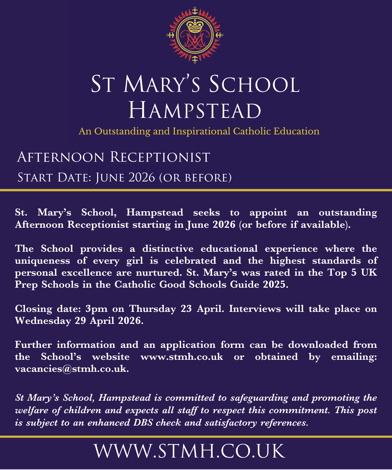St. Mary’s School, Hampstead seeks to appoint an outstanding Afternoon Receptionist from June 2026 (or earlier if possible).